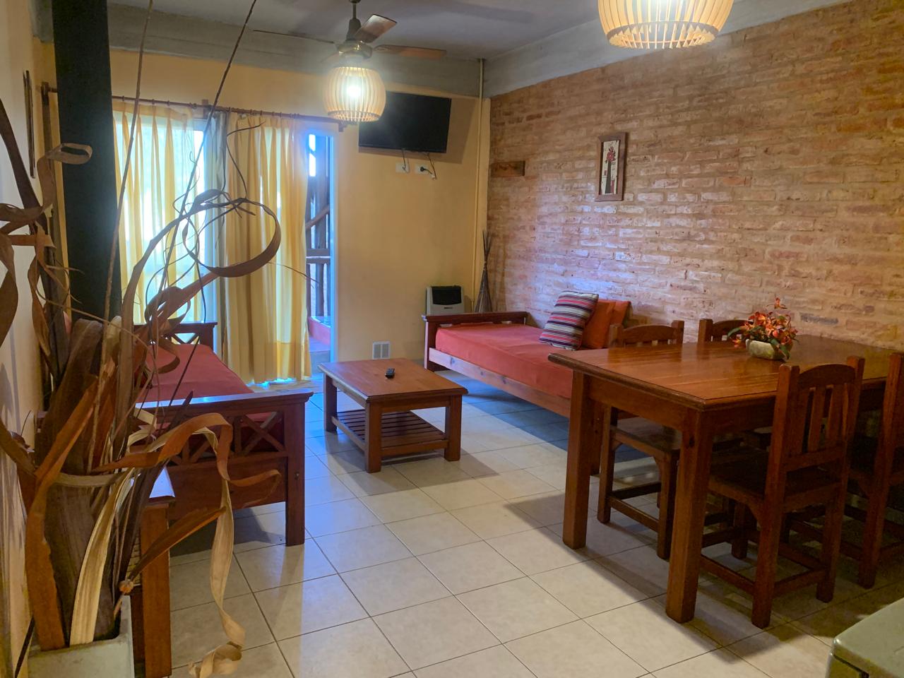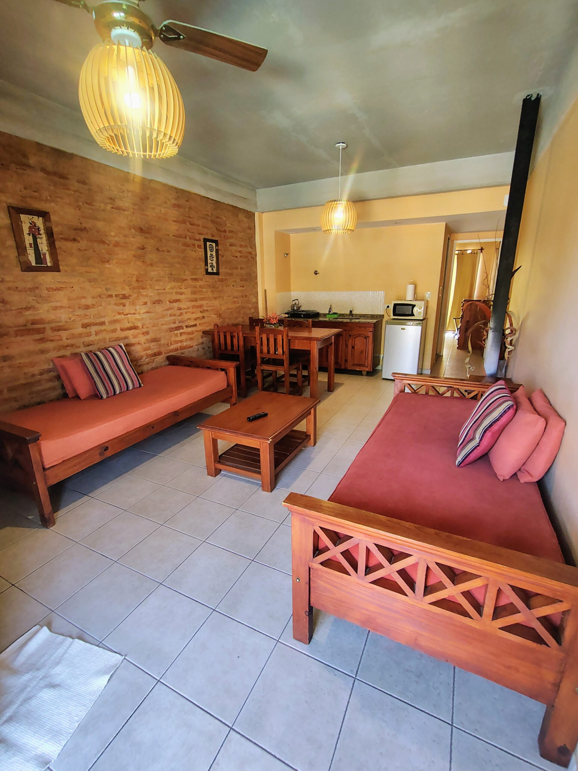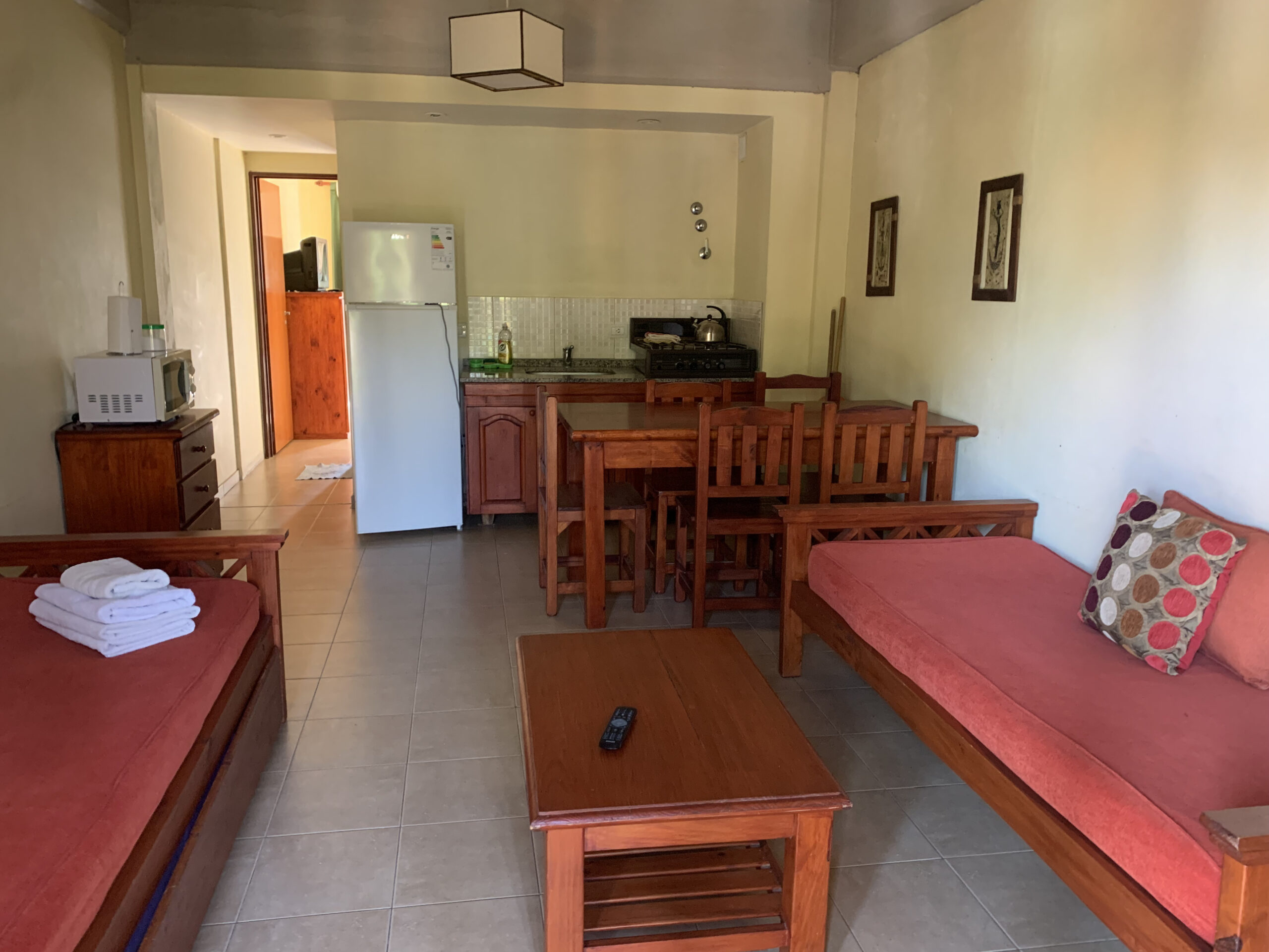 Dormitorio con somnier dos plazas. Estar comedor con una a tres camas. Equipado con anafe, heladera, microondas. Baño completo con ducha.