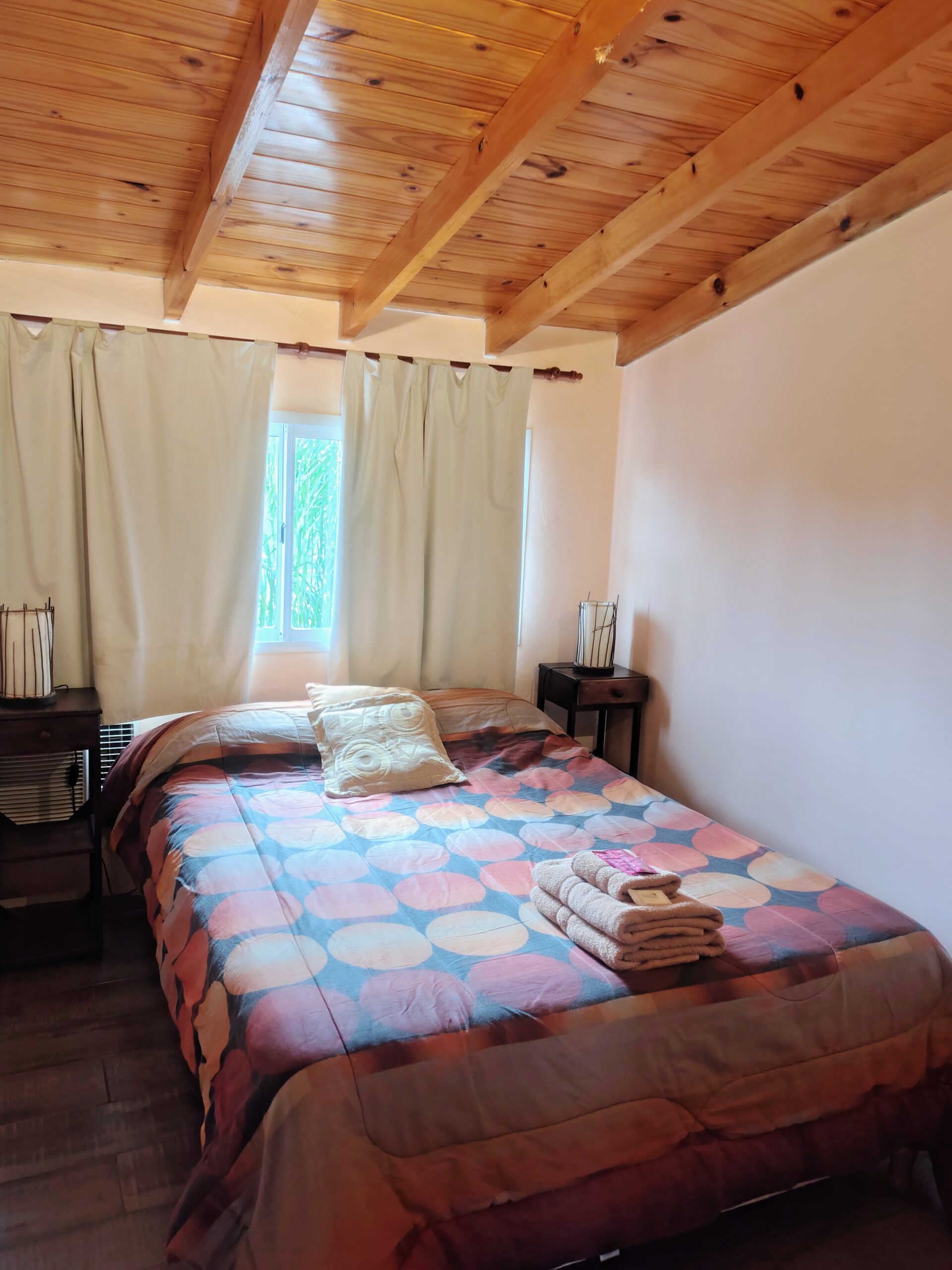 Segundo piso por escaleras. Posee un amplio ventanal al jardín, somier king size y baño completo con ducha. Además, cuenta con frigobar, aire acondicionado, TV con cable y Wi-Fi gratis. El servicio incluye desayuno y acceso a todas las instalaciones.