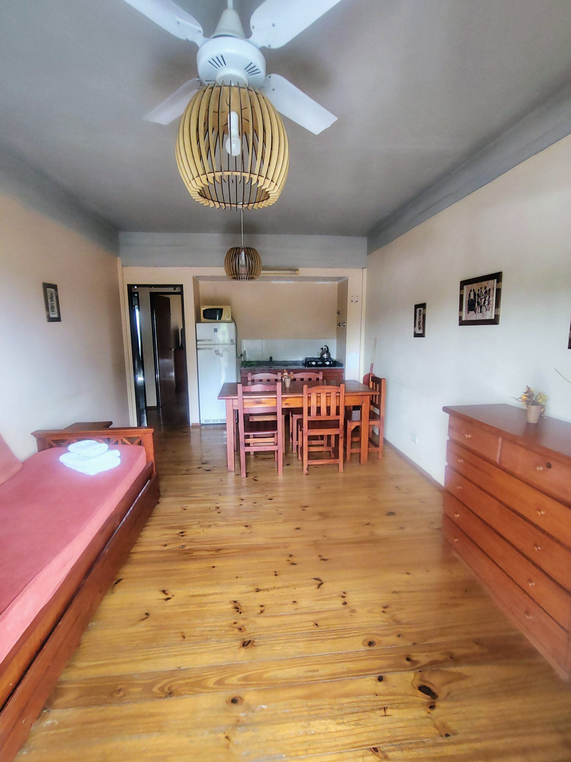 Estar comedor con una a tres camas. Equipado con anafe, heladera y microondas.